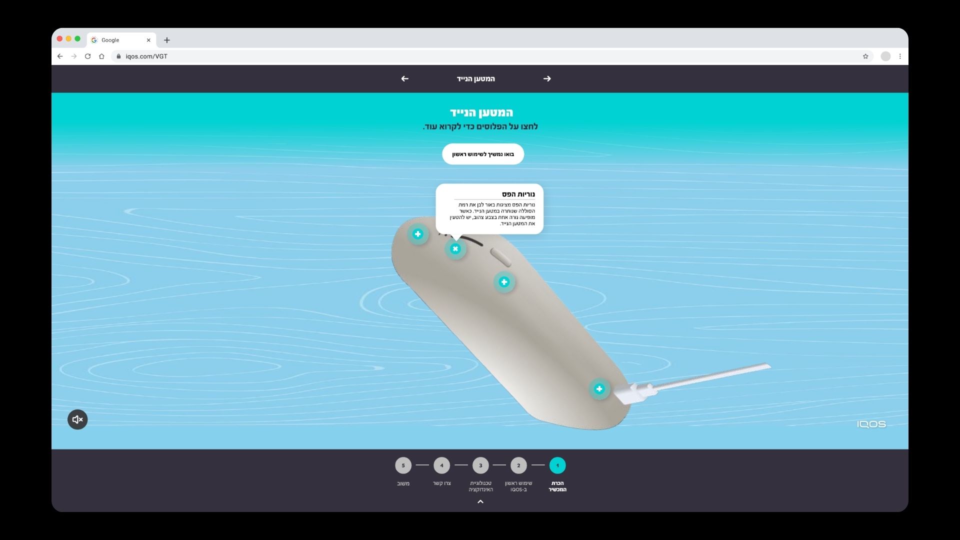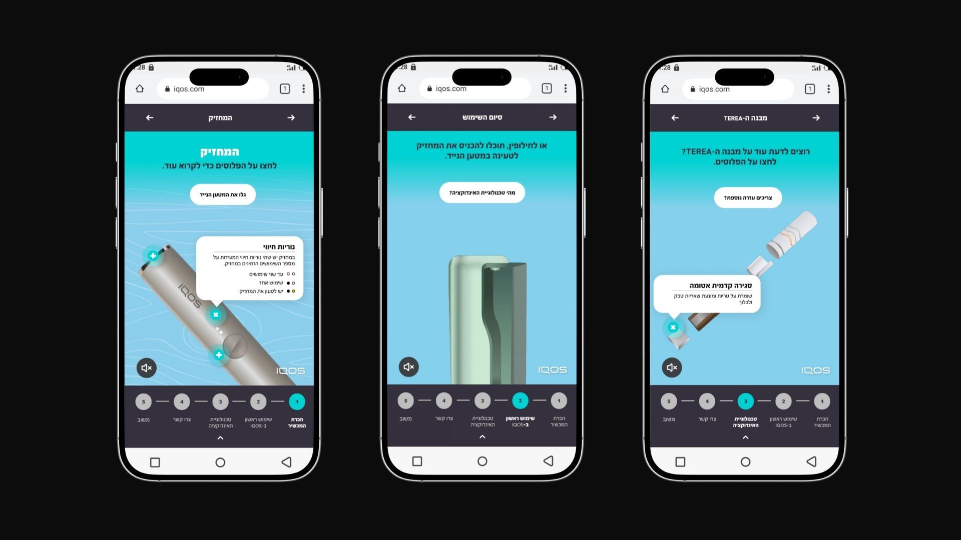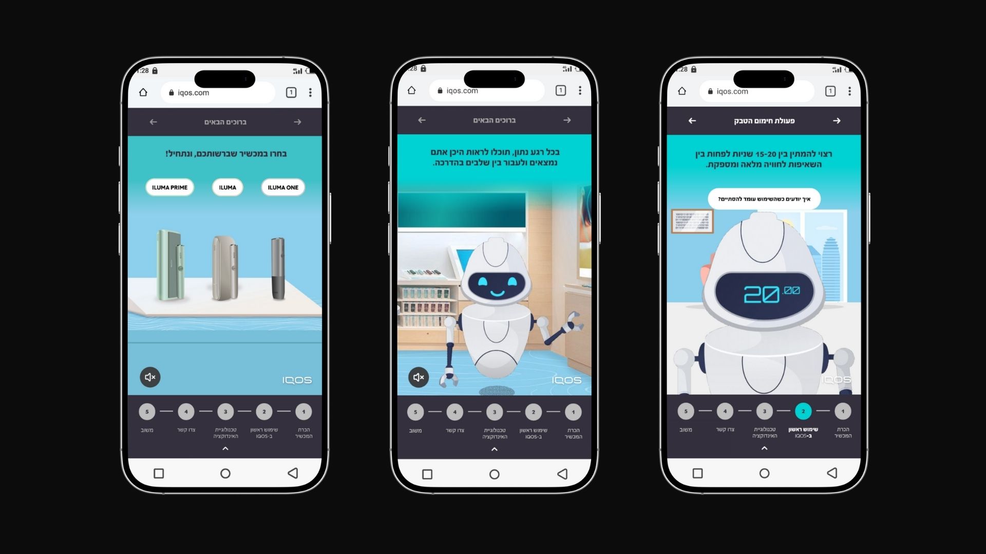 פרויקט זה התחיל באפיון מעמיק של אתגרי השימושיות הקיימים במדריך הווירטואלי הישן, והגדרת פתרונות ברורים ליצירת חוויה חדשה, מקצועית ומגיבה. תהליך ההפקת סרטון אנימציה לעסק התמקד תחילה בכתיבת מסמך דרישות מוצר מפורט, אשר הגדיר את כלל התכונות ואת היוזר פלואוס, כולל תרחישי שימוש מותאמים לכל דגם של מכשיר IQOS. לאחר מכן, צוות הסטודיו שלנו עבד על פיתוח אנימציה לעסקים דינמית, המשלבת את דמות הרובוט המוכרת עם הדרכה ויזואלית ברורה על תפעול המכשירים. במקביל, עוצב ממשק משתמש אלגנטי וידידותי למשתמש, המותאם בצורה מלאה לנייד ולדסקטופ, וכלל מדדי התקדמות המאפשרים למידה בקצב אישי. לבסוף, התבצע שלב הפיתוח של היישום האינטרנטי המלא.