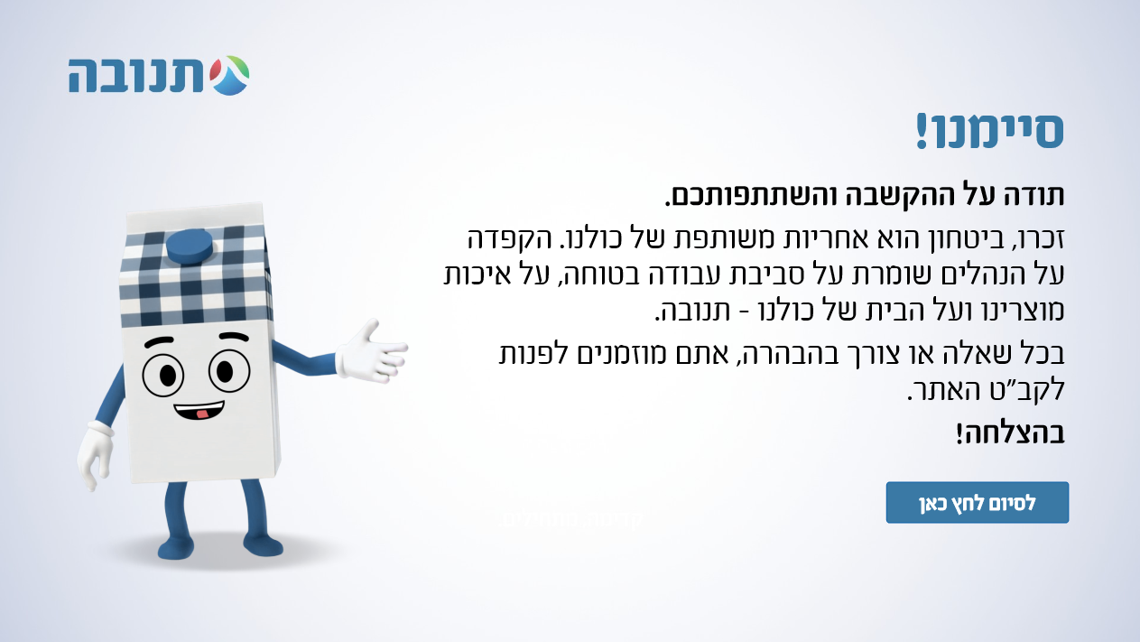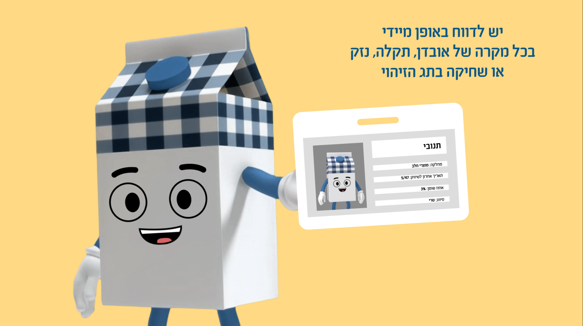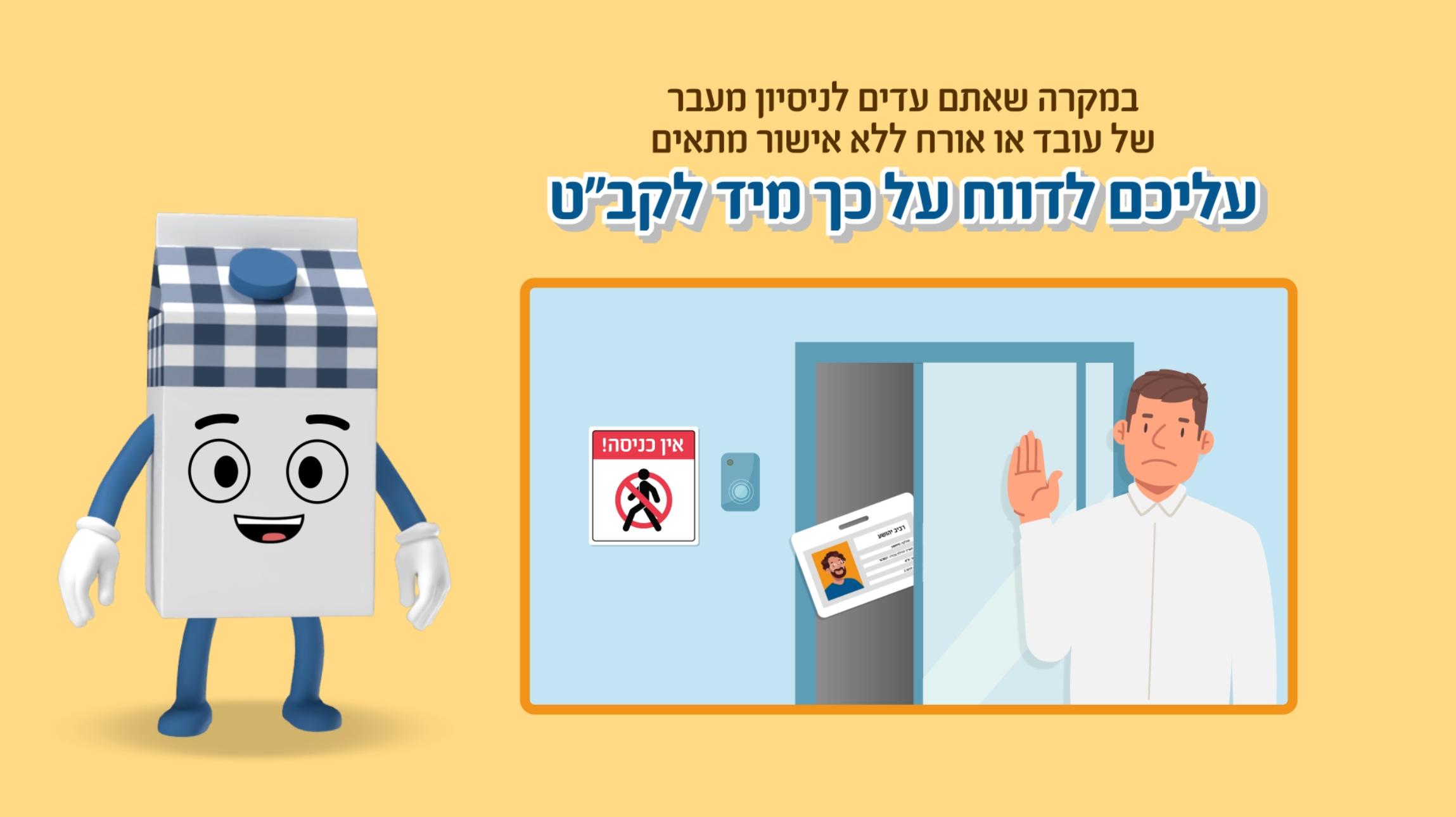 תהליך העבודה התמקד בהפיכת רשימת דרישות אבטחה קפדניות לסדרת סצנות זורמת וברורה. התחלנו בניתוח מעמיק של מסמך הנהלים ופירוקו ליחידות מידע קטנות, כשבכל יחידה עמד אתגר – למשל, מניעת כניסה לא מורשית או טיפול באירועי חירום. לאחר אישור התסריט והסטוריבורד, יצרנו את מודל הדמויות המונפשות, ששילבו את קו הלוגו המעוגל של תנובה, תוך יצירת מגוון דמויות אנושיות המייצגות את חתך העובדים.