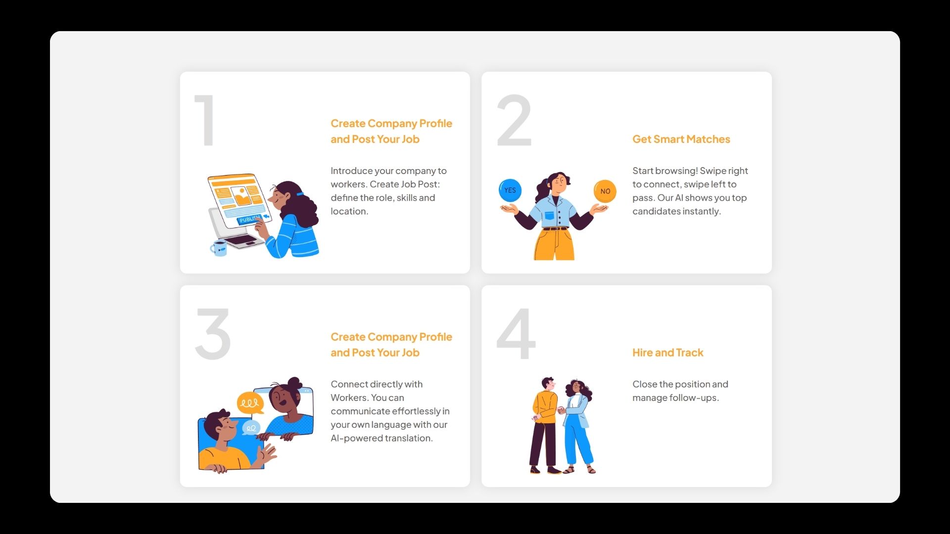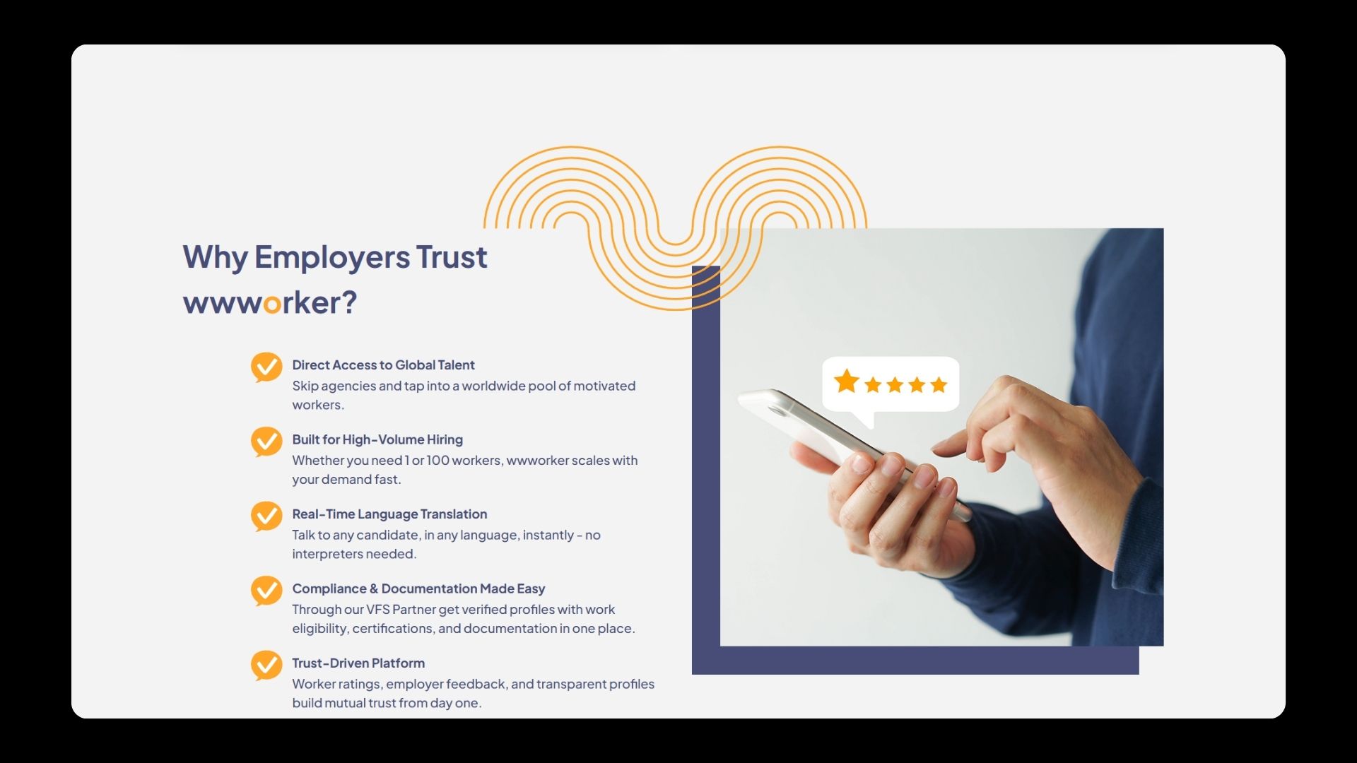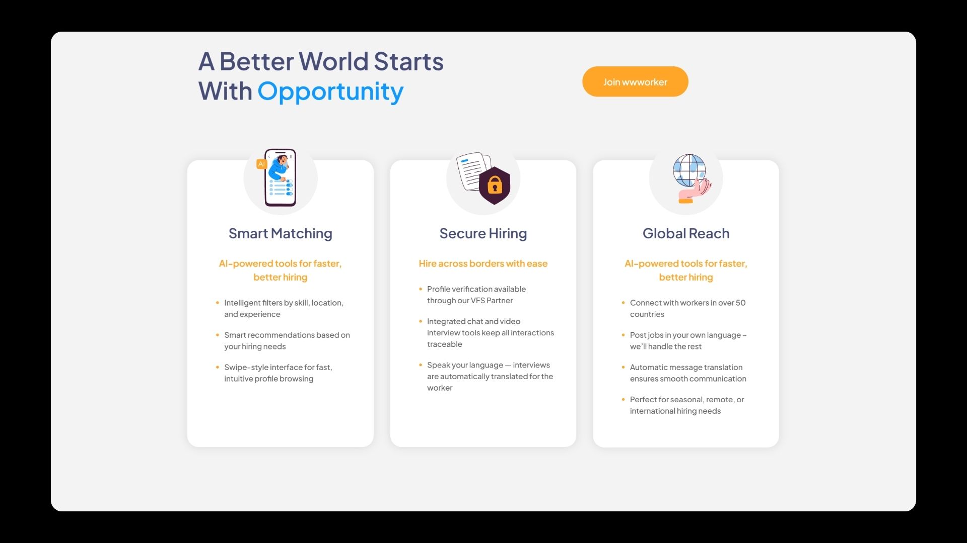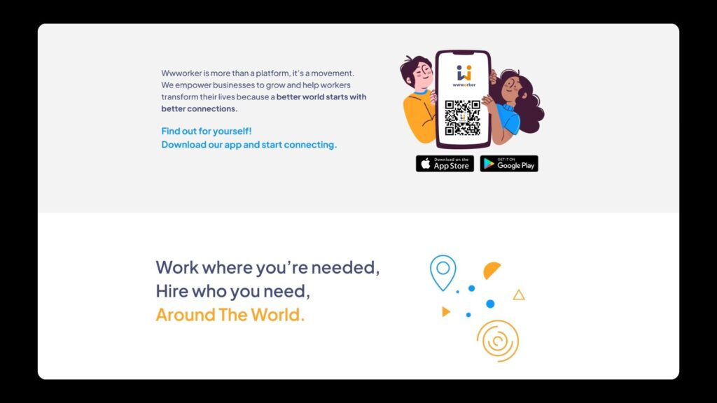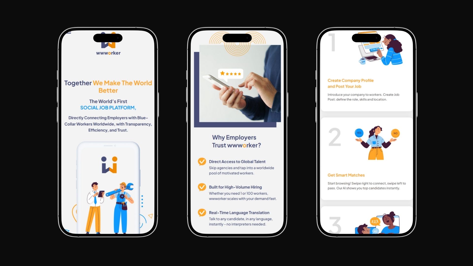הקונספט המרכזי בפרויקט של wwworker, פלטפורמה חברתית גלובלית ל"צווארון הכחול", היה האתגר של להפיח חיים ורגש בשפה ויזואלית מוגמרת. קיבלנו לידינו עיצוב אתרים מוקפד, והמשימה שלנו הייתה להפוך אותו מסטטי לדינמי באמצעות אנימציה ואלמנטים אינטראקטיביים. הרעיון הגדול היה ליצור חווית משתמש זורמת ואינטואיטיבית, המבטאת את המהירות ואת השקיפות של הפלטפורמה: שבירת גבולות ואיתור הזדמנויות באופן מיידי. השימוש במיקרו-אנימציות ובאיורים מונפשים נועד להדגיש את הטכנולוגיה בצורה ידידותית, ולייצר בידול ואנרגיה המשתלבים באופן מושלם ברוח המותג.